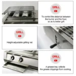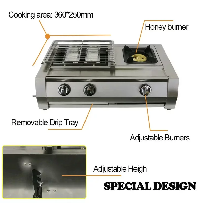 Acest gratar pe gaz, din otel este prevazut cu 2 arzatoare cu infrarosu pt BBQ+ 1 zona de gatit, este rezistent la temperaturi foarte ridicate si are un transfer foarte rapid de caldura.Este reglabil pe inaltime pentru o gatire cat mai uniforma si este prevazut cu o tava de colectare a grasimii, neaderenta, ceea ce o face usor de curatat.Se poate folosi atat in interior in special in zona HORECA (Restaurante,Food-Truck etc.),autorulote cat si in exterior, camping, bbq , petreceri in aer liber.Fabricat din materiale rezistente, gratarul este foarte durabil.Pentru conectarea gratarului la butelia de gaz, sunt necesare un furtun de gaz si un regulator de presiune adecvat, care nu sunt incluse in pachetul de livrare.